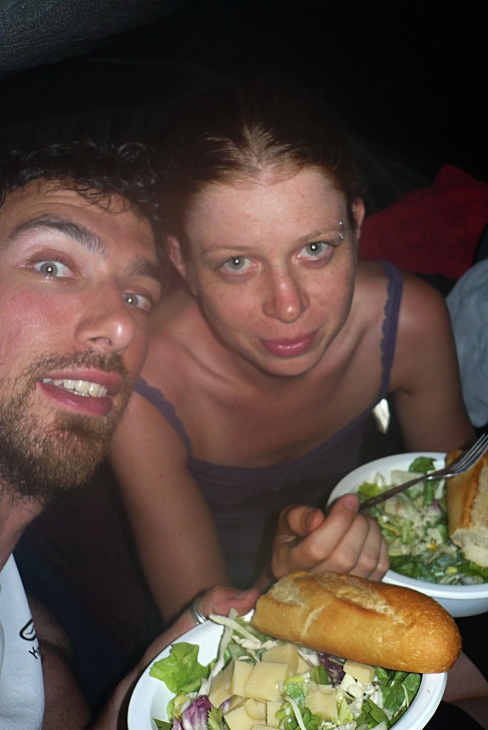 La pluie s'invitant, nous mangeons (salade froide heureusement) dans la tente montée de justesse.