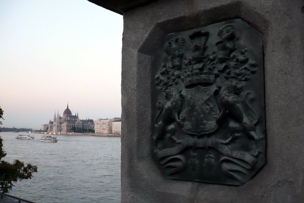 Armoiries du pont Széchenyi (SERVARE INTAMINATUM "Garder intact") et parlement.