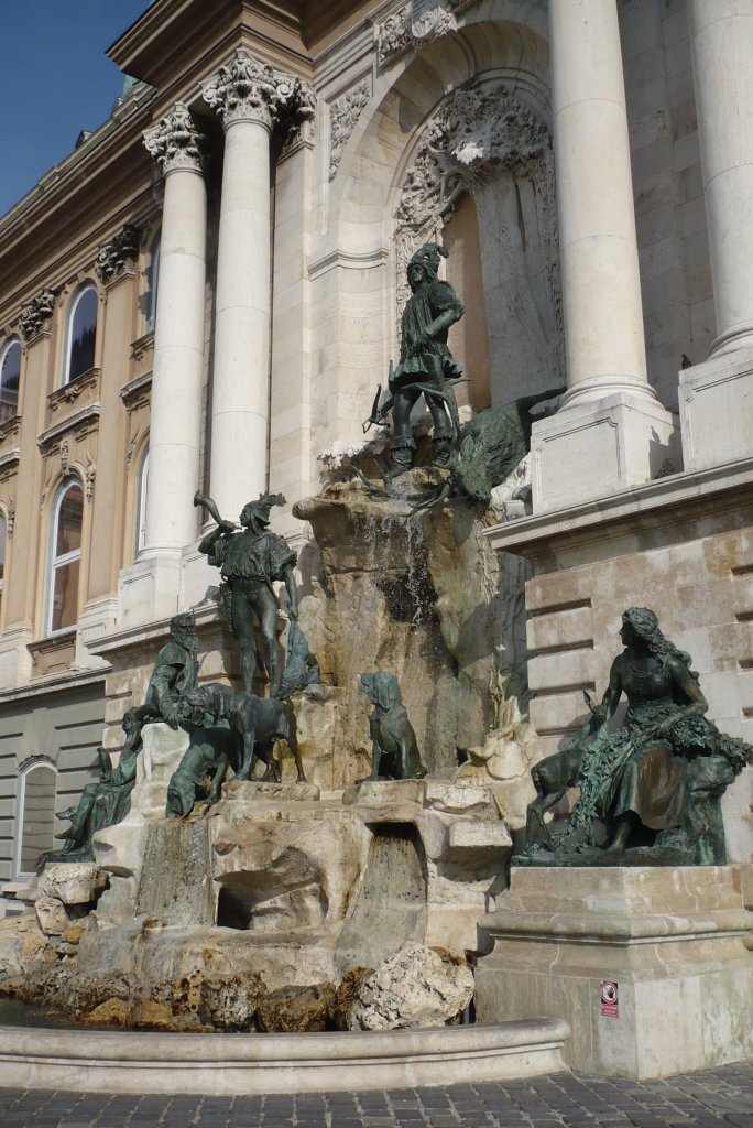 Tableau de chasse grandeur "plus que" nature. Détails : un des chien "boit" l'eau de la fontaine.
